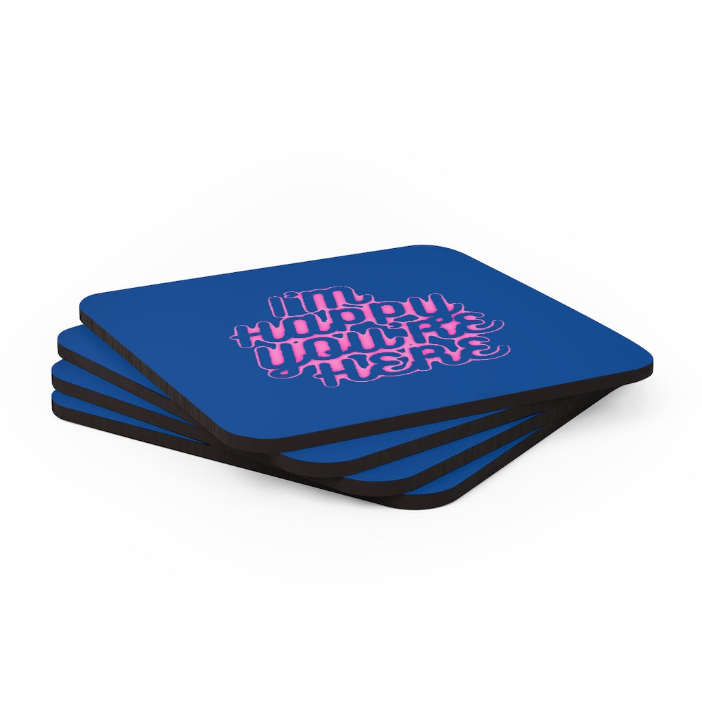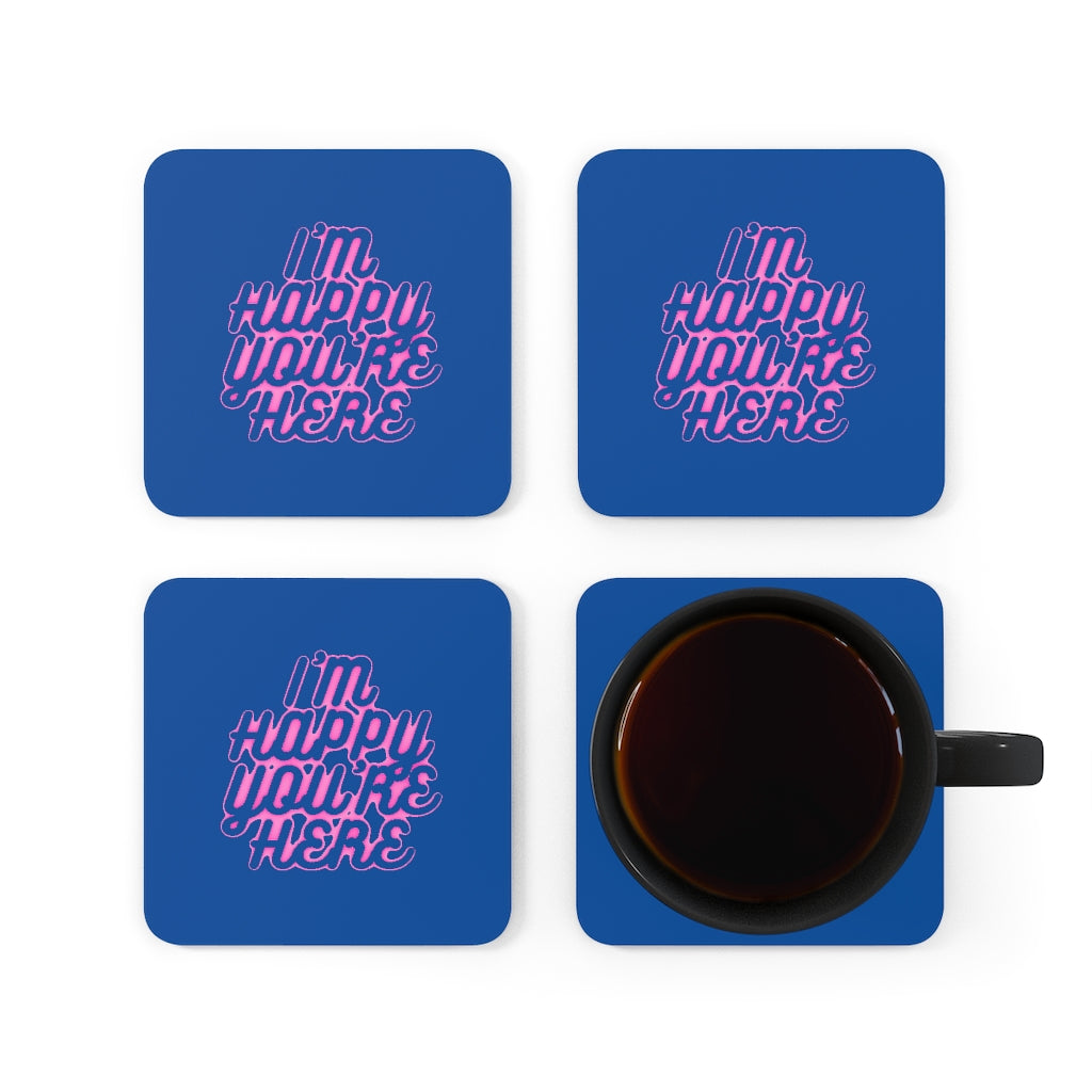 Crafted with genuine cork bottoms, these I'm Happy You're Here coasters are built to last. They’re all topped with polyester-coated hardboard - protecting all your designs for as long as you need. Made in America, these items come in a 3.75″ X 3.75 square shaping. Sold individually, printing is supported on one side.